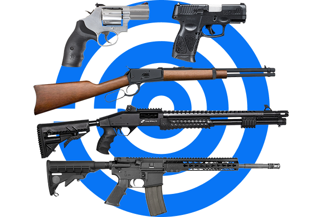 Armas: Espingardas de repetição (pump, lever action – alavanca – e similares, incluindo as de cano duplo, paralelos sobrepostos ou similares, e monotiro. E revólver ou pistola semiautomática.